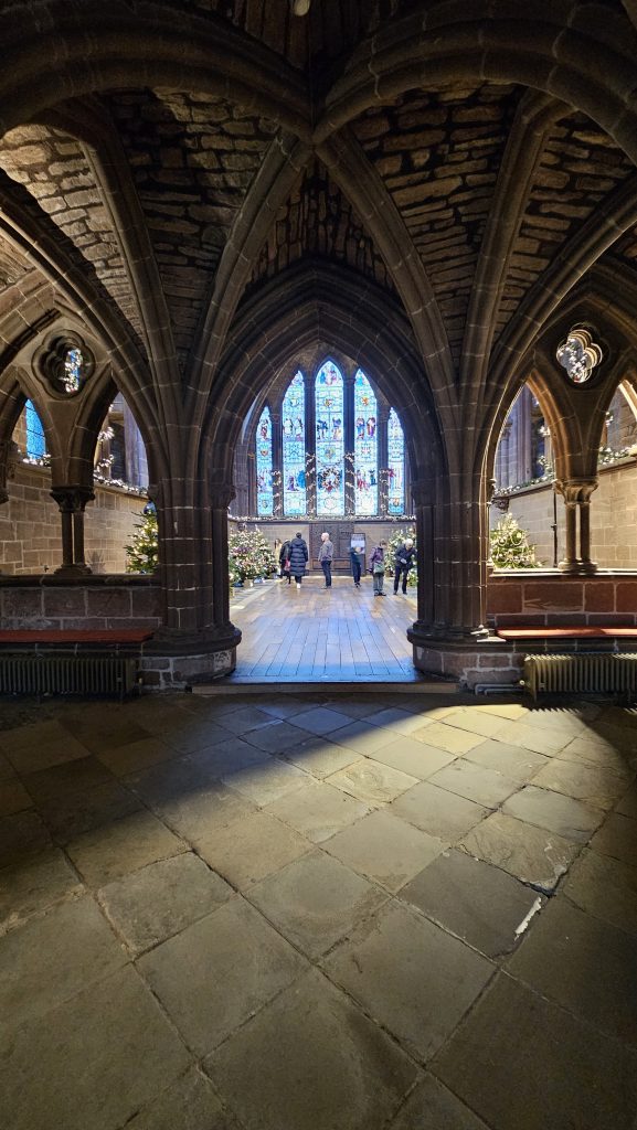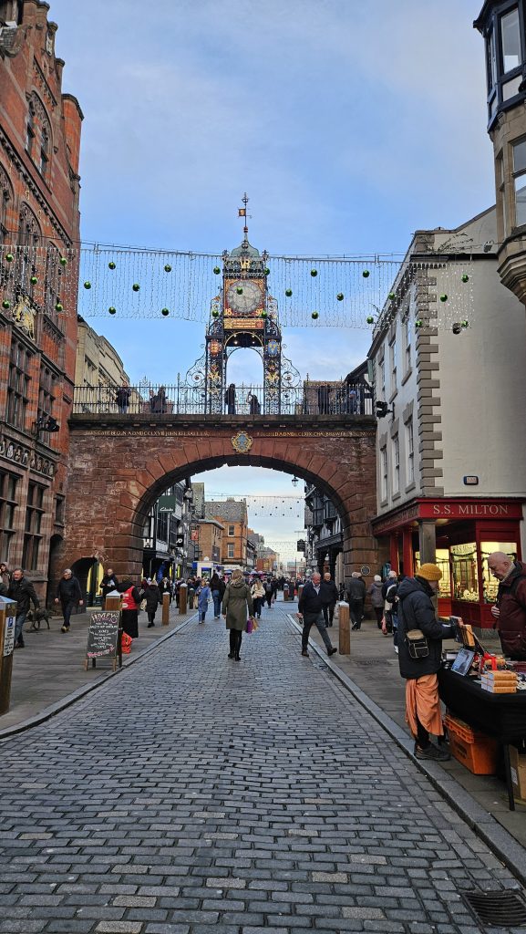 Our last visit of 2025 saw the group leave Hucknall enroute to Chester in beautiful sunshine. As we prepared to leave we were able to watch lorries arriving with some very large funfair rides for the Hucknall’s light switch on the following day.